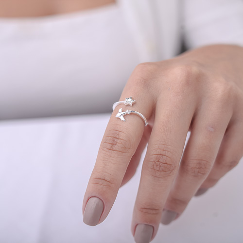 Um encantador acessório de prata que apresenta um design inspirado em um avião e uma estrela. Feito em prata de alta qualidade, o anel possui detalhes meticulosos e acabamento elegante. Seu estilo único e delicado adiciona um toque especial ao seu look. Perfeito para os amantes de aviação ou para aqueles que apreciam acessórios temáticos e encantadores.