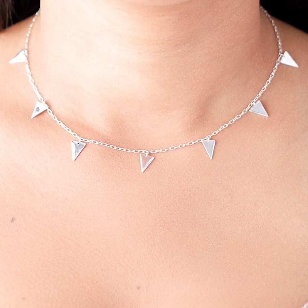 Apresenta um design com pingentes de triângulos. Os triângulos são pendurados ao longo da corrente, criando um efeito geométrico e moderno com 7 Triângulos.