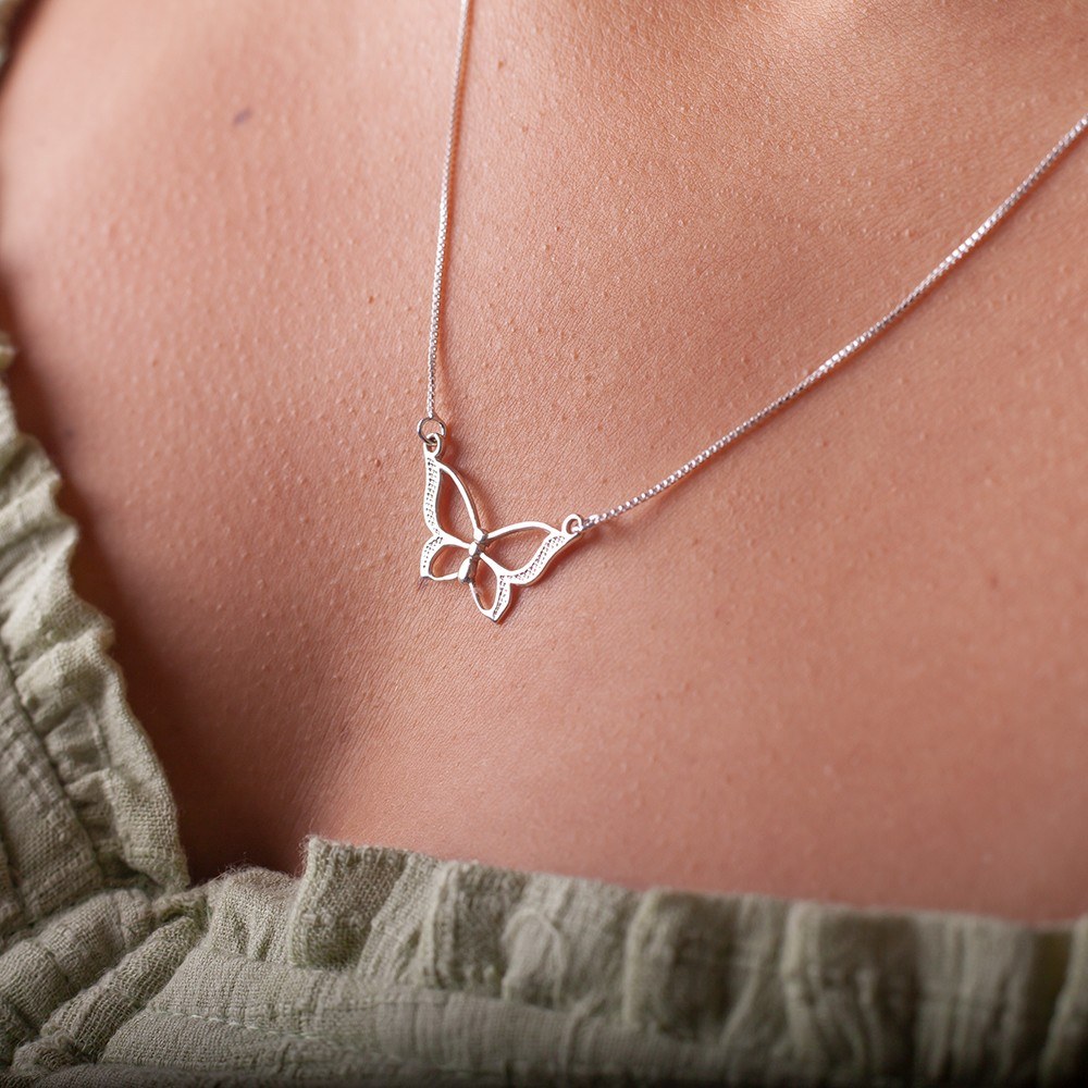O Colar Borboleta Vazada em Prata é uma joia encantadora que traz um toque de leveza e elegância ao seu visual. Feito em prata de alta qualidade, o pingente em forma de borboleta vazada apresenta um design delicado e detalhado. Use este colar para adicionar um toque encantador ao seu estilo diário ou em ocasiões especiais. Adquira agora e deixe sua beleza voar livremente com esta joia simbólica de transformação.