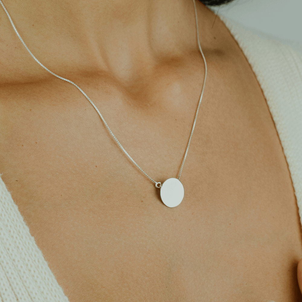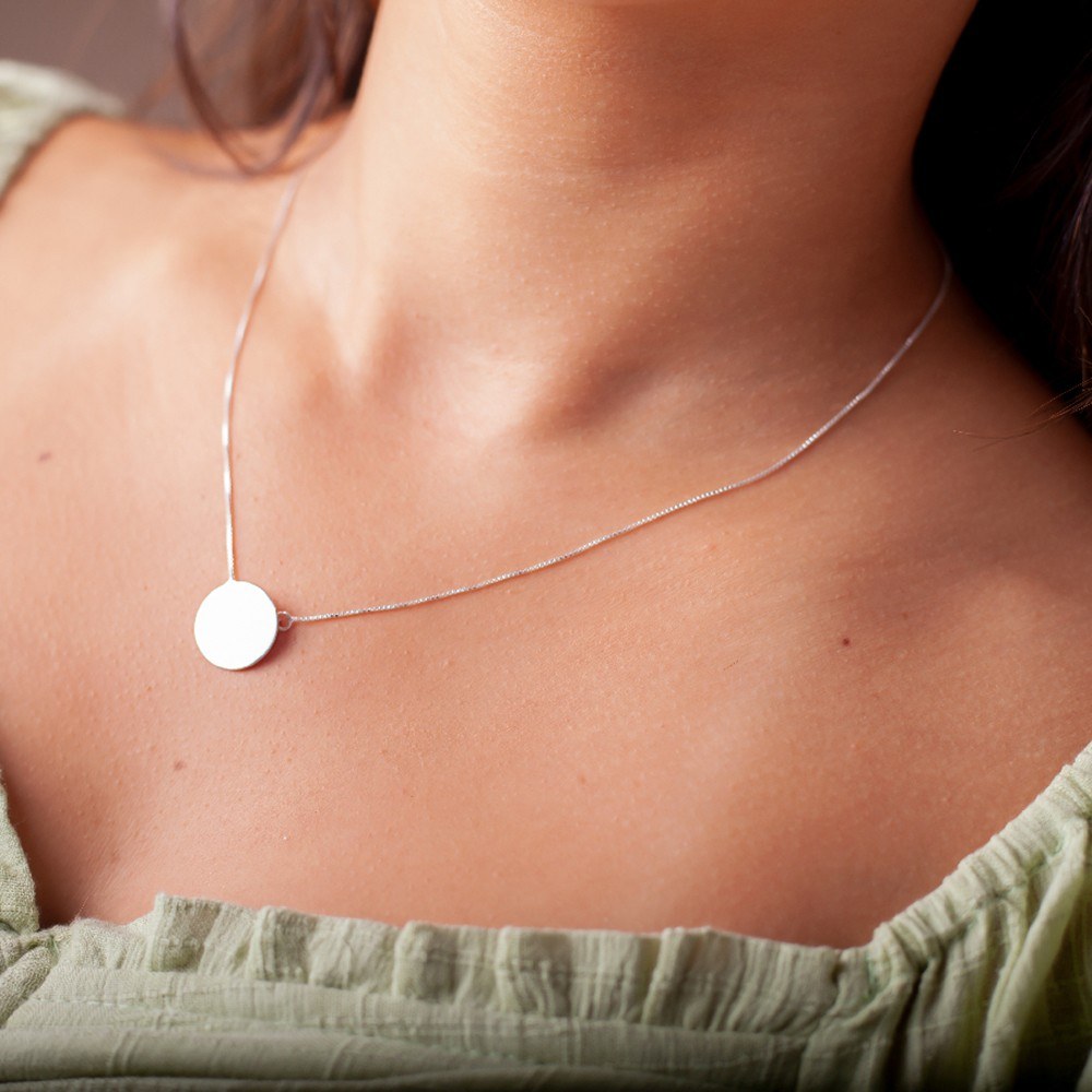 Uma peça moderna e elegante feita em prata. Possui um pingente em formato de círculo liso e plano, que representa a união e a harmonia. O design minimalista do colar torna-o versátil e fácil de combinar com diferentes estilos de roupas. Seu acabamento em prata proporciona um brilho discreto e sofisticado. É uma escolha perfeita para adicionar um toque de estilo e elegância ao seu visual diário ou em ocasiões especiais. O colar “Círculo Chapa” é uma peça clássica que certamente irá complementar qualquer coleção de joias.