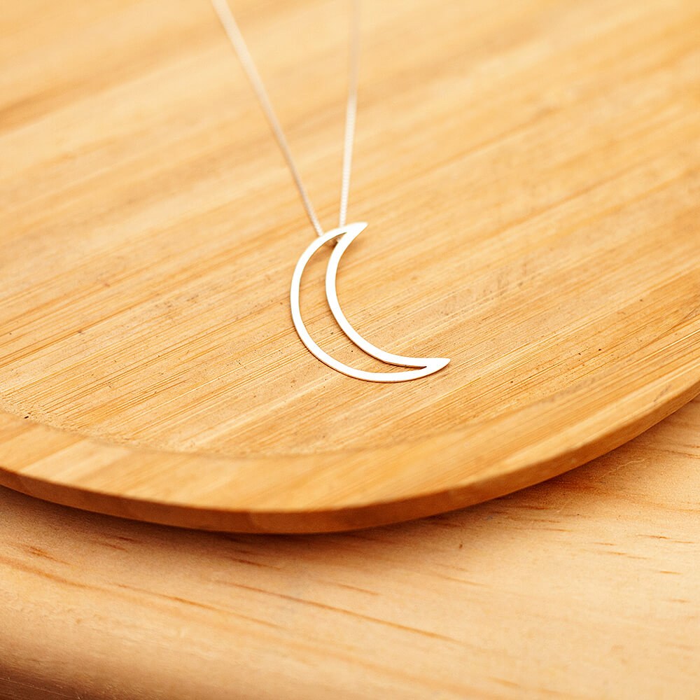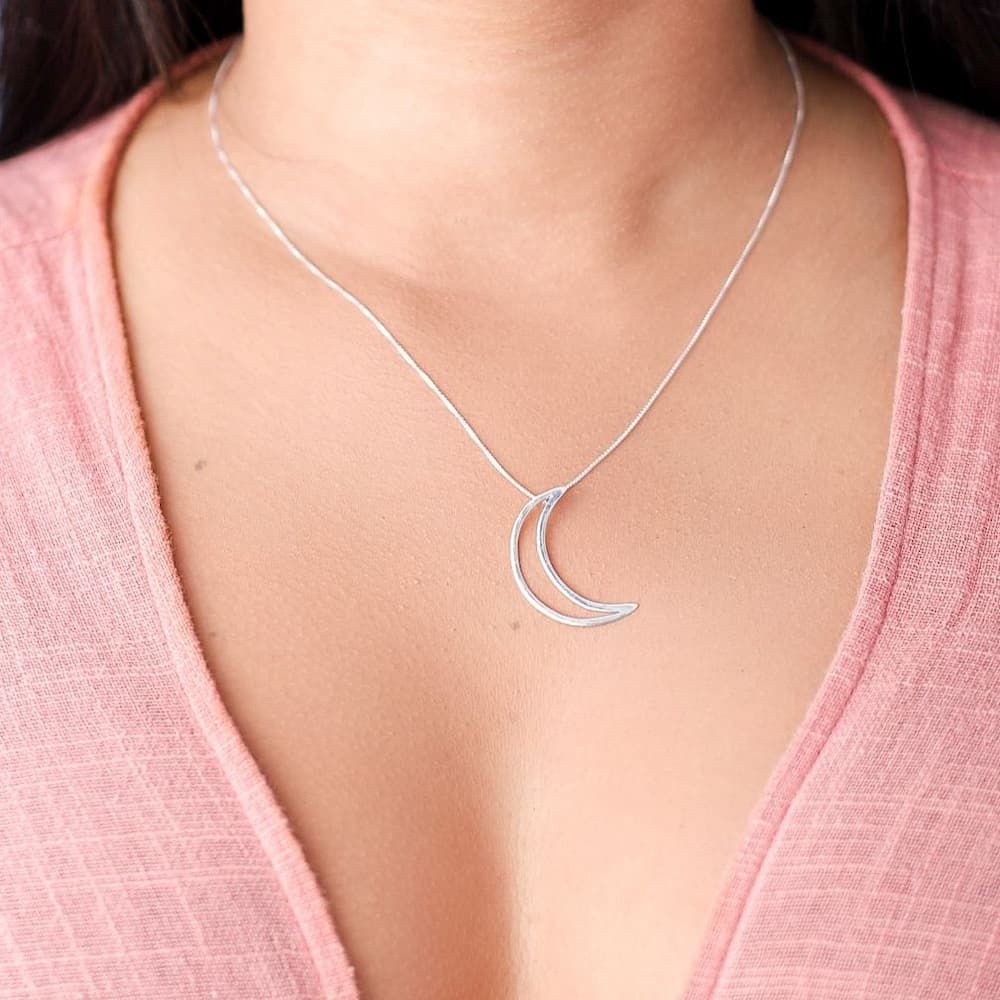 Um colar encantador com um pingente em forma de lua vazada. Feito em prata de alta qualidade, apresenta um design elegante e minimalista, ideal para adicionar um toque celestial ao seu estilo. A lua vazada representa mistério, intuição e conexão com o cosmos. Esse colar é perfeito para uso diário ou para complementar looks mais sofisticados. Um acessório versátil que adiciona um toque de encanto ao seu visual.