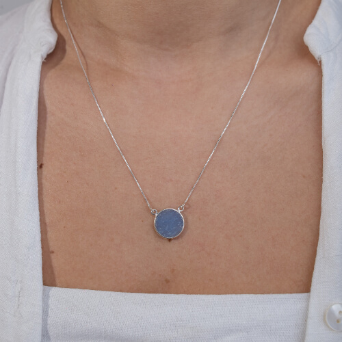 O Colar Sodalita Círculo é uma peça sofisticada que combina a qualidade da prata 925 com a beleza da pedra natural sodalita em formato circular, medindo aproximadamente 12 mm. Seu design moderno e elegante valoriza o brilho e a cor azul intensa da sodalita, conferindo um toque de personalidade e frescor ao visual. Com acabamento polido e comprimento de 45 cm, essa peça é perfeita para quem busca um acessório versátil, ideal para o dia a dia ou ocasiões especiais.