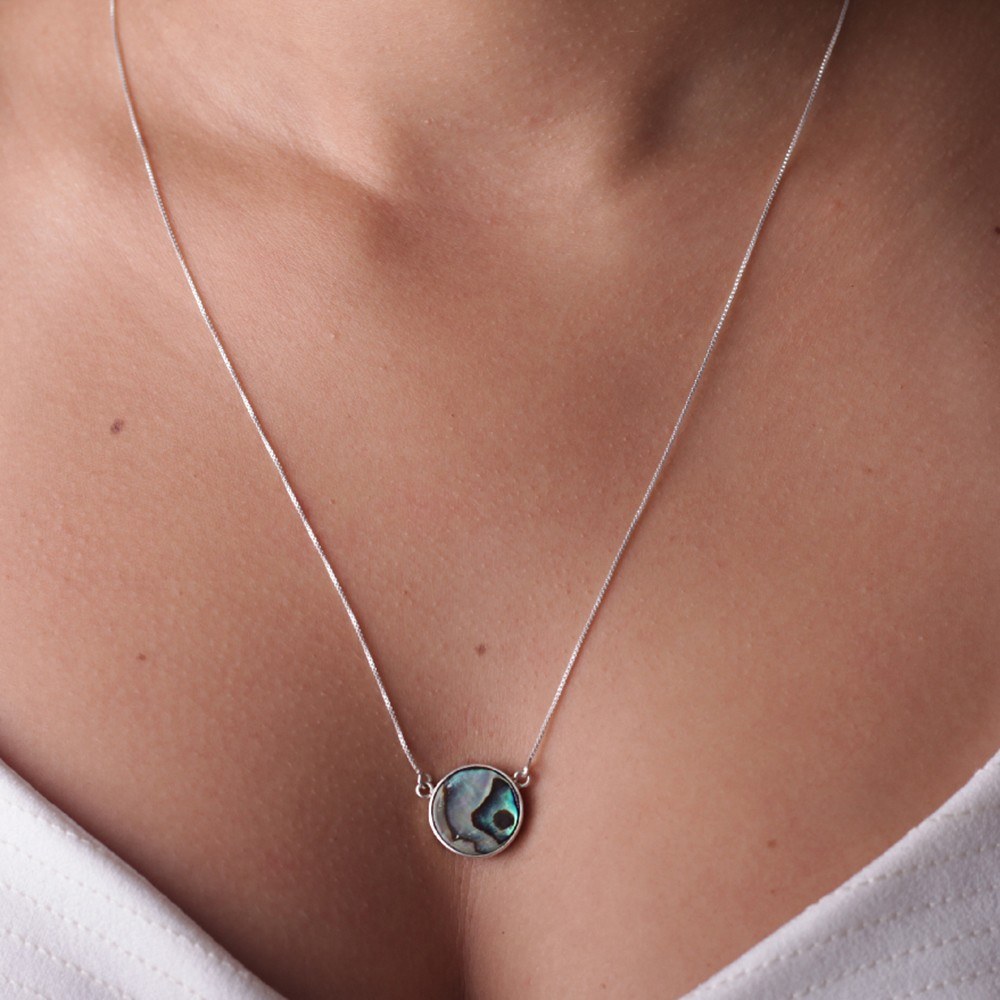 Adicione um toque de beleza e autenticidade ao seu visual com o Escapulário Abalone em Prata. Apresentando uma moeda de Abalone em prata de alta qualidade, este acessório combina a iridescência e as cores vibrantes da pedra natural. A corrente em prata completa o design elegante desta peça única. Eleve seu estilo com esta joia de beleza exótica.