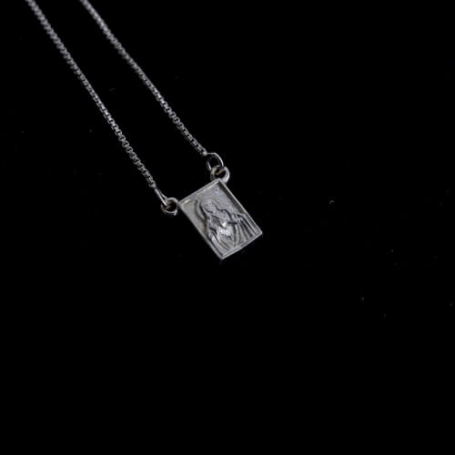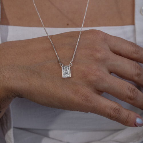 Um símbolo de fé e proteção, o Escapulário Sagrado Coração de Jesus e Maria é confeccionado em prata 925, com placas retangulares delicadas que medem aproximadamente 0,9 cm de altura por 0,6 cm de largura. Com comprimento de 60 cm, essa peça une tradição e elegância, ideal para quem deseja carregar consigo uma joia com significado especial.