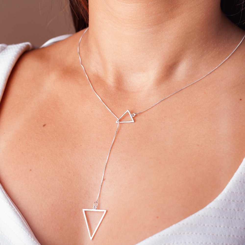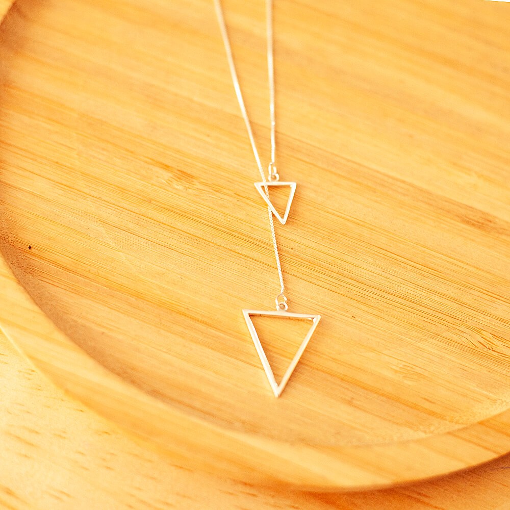 A gravatinha triângulos grande é um colar de prata com dois pingentes em forma de triângulos. Um dos triângulos é maior que o outro, o que cria um contraste visual interessante. A corrente passa através desses dois pingentes, proporcionando um estilo único e elegante. É uma opção de acessório versátil que pode complementar diversos looks, adicionando um toque moderno e sofisticado.