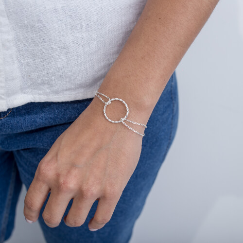 A Pulseira Dupla Círculo Torcido é uma peça sofisticada feita em prata 925, que combina design moderno com detalhes delicados. Apresenta um círculo central retorcido de aproximadamente 1,8 cm de diâmetro, que traz textura e movimento ao visual. A estrutura da pulseira é composta por duas partes: um lado fechado que envolve o pulso com aproximadamente 7,5 cm e outro lado com fecho, totalizando cerca de 18,5 cm de comprimento, garantindo ajuste perfeito e conforto. Ideal para quem busca uma joia marcante, elegante e versátil para usar em diversas ocasiões.